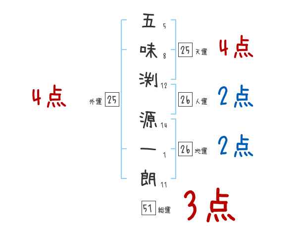 天運![]() | 五味渕源一朗さんの天運は25画の4つ星!個性があり才能があふれる。強運の持ち主で発展する。 家系が持つ宿命的な運勢を表します。祖先から受け継いだ苗字ですので自分の力が及びません。家柄を象徴します。 |