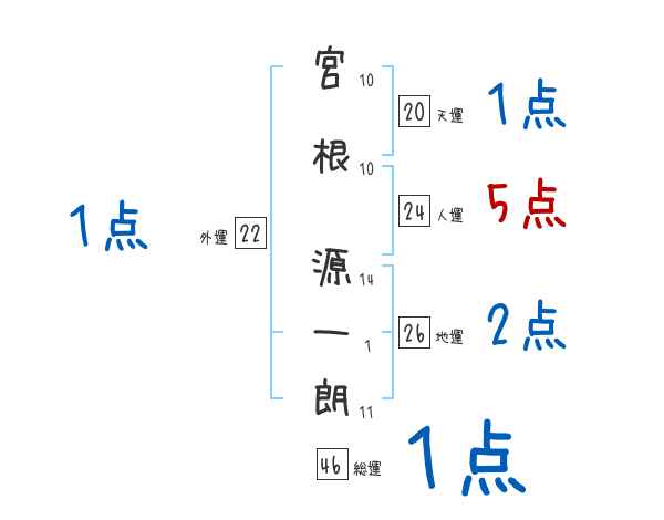 外運![]() | 宮根源一朗さんの外運は22画の1つ星!努力することが苦手ないっぽう手先が器用。芸術性にも優れる。 生活面を象徴する運勢です。外部から受ける影響力を表し、結婚運、家庭運や職場、環境への順応性を表します。 |