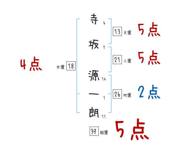 天運![]() | 寺坂源一朗さんの天運は13画の5つ星!才能に恵まれ人気がある。名声を手に入れる。円満な人生。 家系が持つ宿命的な運勢を表します。祖先から受け継いだ苗字ですので自分の力が及びません。家柄を象徴します。 |