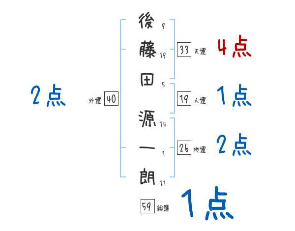 総運![]() | 後藤田源一朗さんの総運は59画の1つ星!意志の弱さであきらめることが多いかも。粘り強さが必要。 あなたの人生を表す1番重要な運勢です。生涯を通じて影響する総合運となり、主に50歳以降の晩年期に影響を及ぼします。 |