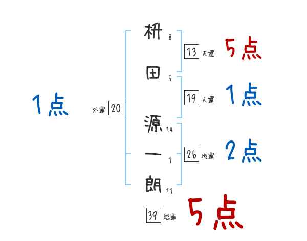総運![]() | 枡田源一朗さんの総運は39画の5つ星!社交性に優れ人望が厚い。人の上に立ち成功する。 あなたの人生を表す1番重要な運勢です。生涯を通じて影響する総合運となり、主に50歳以降の晩年期に影響を及ぼします。 |