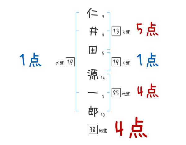 外運![]() | 仁井田源一郎さんの外運は19画の1つ星!優れた才能を持ちますが、協調性が足りないことも。周りの人と協力する事を意識しましょう。 生活面を象徴する運勢です。外部から受ける影響力を表し、結婚運、家庭運や職場、環境への順応性を表します。 |