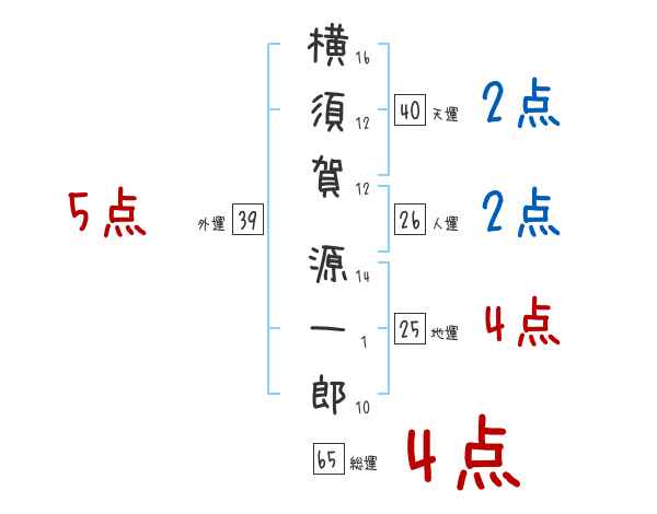天運![]() | 横須賀源一郎さんの天運は40画の2つ星!自信過剰で物事に固執するためトラブルに注意。 家系が持つ宿命的な運勢を表します。祖先から受け継いだ苗字ですので自分の力が及びません。家柄を象徴します。 |