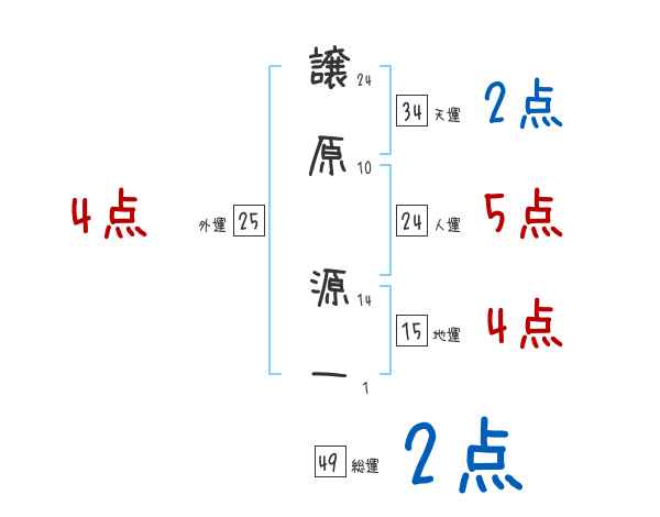 天運![]() | 譲原源一さんの天運は34画の2つ星!独創性に優れるが、自尊心が強く災難に注意しましょう。 家系が持つ宿命的な運勢を表します。祖先から受け継いだ苗字ですので自分の力が及びません。家柄を象徴します。 |