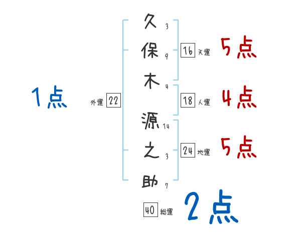 天運![]() | 久保木源之助さんの天運は16画の5つ星!人望が厚く大きく発展する。逆転成功が見える。 家系が持つ宿命的な運勢を表します。祖先から受け継いだ苗字ですので自分の力が及びません。家柄を象徴します。 |