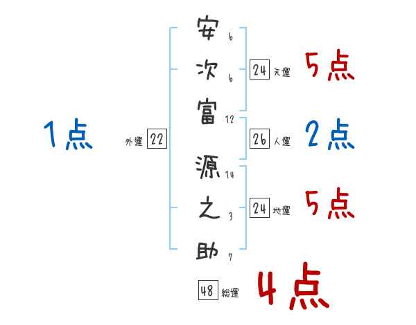 天運![]() | 安次富源之助さんの天運は24画の5つ星!家庭運が良く順調な人生。金運にも恵まれる。 家系が持つ宿命的な運勢を表します。祖先から受け継いだ苗字ですので自分の力が及びません。家柄を象徴します。 |