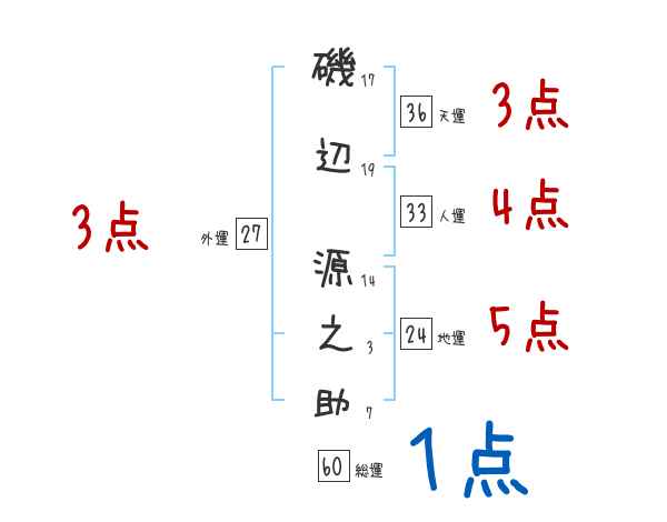 総運![]() | 磯辺源之助さんの総運は60画の1つ星!悲観的で迷いやすい。波乱が多く損をしないように。 あなたの人生を表す1番重要な運勢です。生涯を通じて影響する総合運となり、主に50歳以降の晩年期に影響を及ぼします。 |