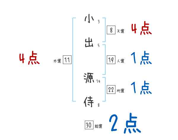 天運![]() | 小出源侍さんの天運は8画の4つ星!勤勉家。根気強く努力し成功する。忍耐力がある。 家系が持つ宿命的な運勢を表します。祖先から受け継いだ苗字ですので自分の力が及びません。家柄を象徴します。 |