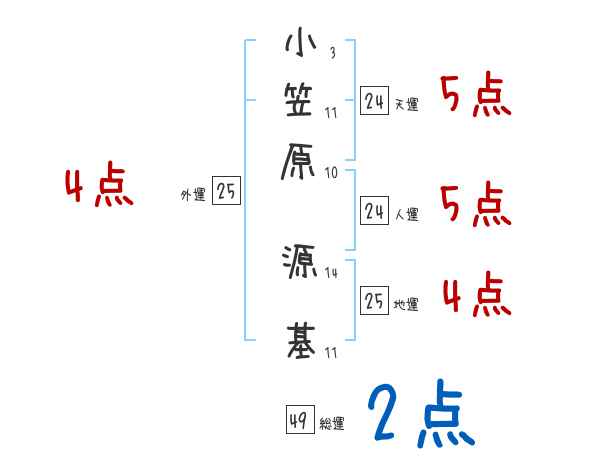 天運![]() | 小笠原源基さんの天運は24画の5つ星!家庭運が良く順調な人生。金運にも恵まれる。 家系が持つ宿命的な運勢を表します。祖先から受け継いだ苗字ですので自分の力が及びません。家柄を象徴します。 |