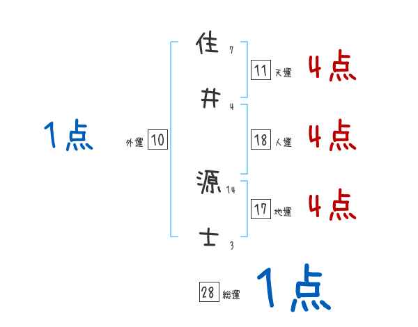 総運![]() | 住井源士さんの総運は28画の1つ星!家庭環境に注意。スポーツで活躍できる能力があるかも。 あなたの人生を表す1番重要な運勢です。生涯を通じて影響する総合運となり、主に50歳以降の晩年期に影響を及ぼします。 |