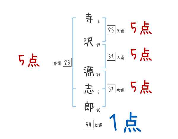 天運![]() | 寺沢源志郎さんの天運は23画の5つ星!想像力に優れ活力がある。一代で成功し名誉を手に入れる。 家系が持つ宿命的な運勢を表します。祖先から受け継いだ苗字ですので自分の力が及びません。家柄を象徴します。 |