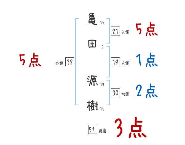 外運![]() | 亀田源樹さんの外運は32画の5つ星!柔軟性があり成功する。チャンスが多く金運が良い。 生活面を象徴する運勢です。外部から受ける影響力を表し、結婚運、家庭運や職場、環境への順応性を表します。 |