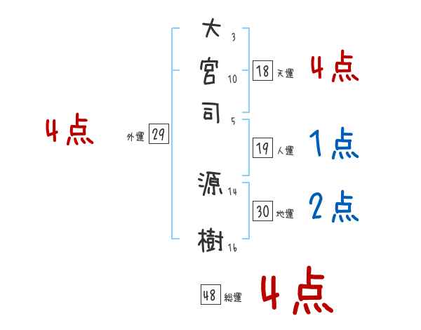 外運![]() | 大宮司源樹さんの外運は29画の4つ星!完全主義で才能がある。厳格な心の持ち主。 生活面を象徴する運勢です。外部から受ける影響力を表し、結婚運、家庭運や職場、環境への順応性を表します。 |