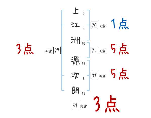 総運![]() | 上江洲源次朗さんの総運は51画の3つ星!変化が激しく、危険に注意。堅実な性格。 あなたの人生を表す1番重要な運勢です。生涯を通じて影響する総合運となり、主に50歳以降の晩年期に影響を及ぼします。 |