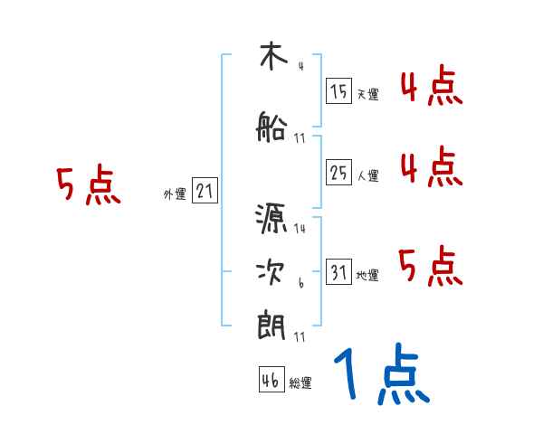 外運![]() | 木船源次朗さんの外運は21画の5つ星!統率力がある。独立し成功する。名誉を手に入れる。 生活面を象徴する運勢です。外部から受ける影響力を表し、結婚運、家庭運や職場、環境への順応性を表します。 |