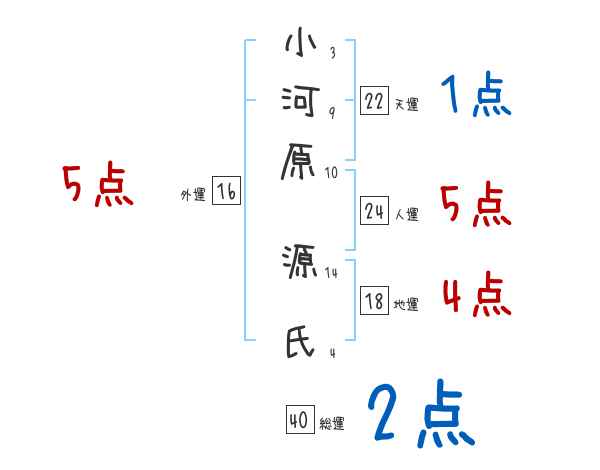 | 外運  | 小河原源氏さんの外運は16画の5つ星!人望が厚く大きく発展する。逆転成功が見える。生活面を象徴する運勢です。外部から受ける影響力を表し、結婚運、家庭運や職場、環境への順応性を表します。 |
