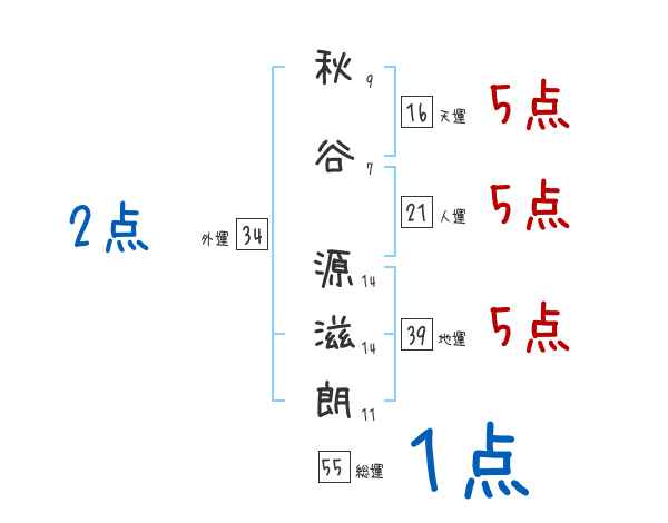 天運![]() | 秋谷源滋朗さんの天運は16画の5つ星!人望が厚く大きく発展する。逆転成功が見える。 家系が持つ宿命的な運勢を表します。祖先から受け継いだ苗字ですので自分の力が及びません。家柄を象徴します。 |