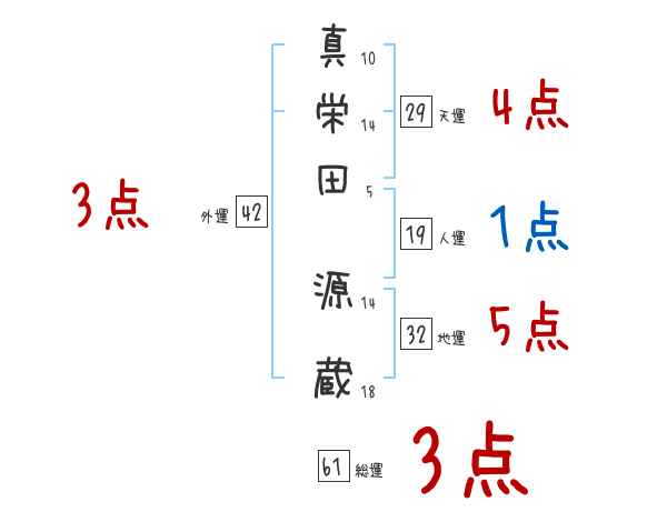 総運![]() | 真栄田源蔵さんの総運は61画の3つ星!強情な性格でうぬぼれタイプ。自ら破滅する。 あなたの人生を表す1番重要な運勢です。生涯を通じて影響する総合運となり、主に50歳以降の晩年期に影響を及ぼします。 |