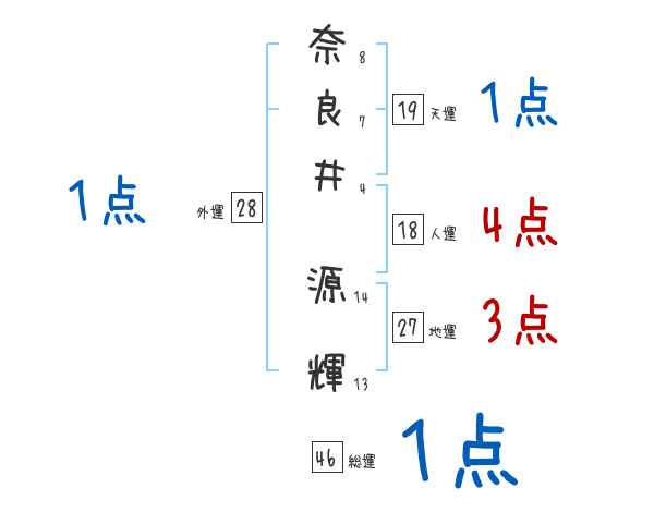 天運![]() | 奈良井源輝さんの天運は19画の1つ星!優れた才能を持ちますが、協調性が足りないことも。周りの人と協力する事を意識しましょう。 家系が持つ宿命的な運勢を表します。祖先から受け継いだ苗字ですので自分の力が及びません。家柄を象徴します。 |