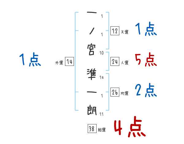 人運![]() | 一ノ宮準一朗さんの人運は24画の5つ星!家庭運が良く順調な人生。金運にも恵まれる。 性格や才能などを表す2番目に重要な運勢です。人間関係や協調性、社会的な成功に影響します。主に20歳から50歳ぐらいまでの中年期の運勢を表します。 |
