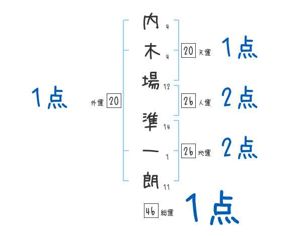 総運![]() | 内木場準一朗さんの総運は46画の1つ星!迷走することが多く苦労するかも。目先のことにとらわれないように。 あなたの人生を表す1番重要な運勢です。生涯を通じて影響する総合運となり、主に50歳以降の晩年期に影響を及ぼします。 |