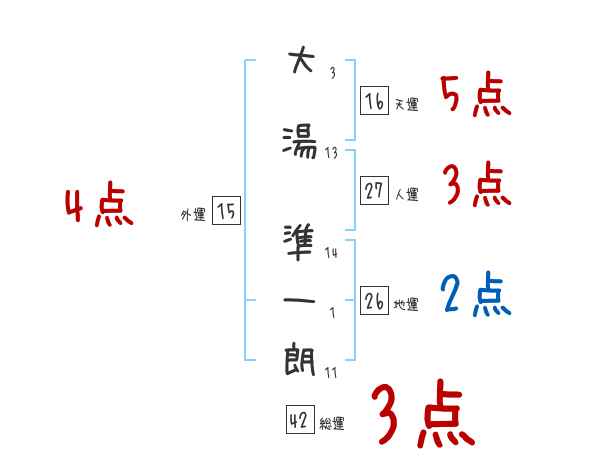 外運![]() | 大湯準一朗さんの外運は15画の4つ星!人徳があり出世する。順調に物事を進め円満な人生。 生活面を象徴する運勢です。外部から受ける影響力を表し、結婚運、家庭運や職場、環境への順応性を表します。 |