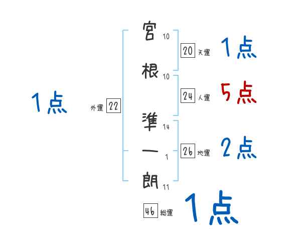 外運![]() | 宮根準一朗さんの外運は22画の1つ星!努力することが苦手ないっぽう手先が器用。芸術性にも優れる。 生活面を象徴する運勢です。外部から受ける影響力を表し、結婚運、家庭運や職場、環境への順応性を表します。 |
