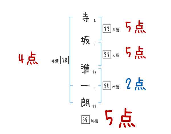 総運![]() | 寺坂準一朗さんの総運は39画の5つ星!社交性に優れ人望が厚い。人の上に立ち成功する。 あなたの人生を表す1番重要な運勢です。生涯を通じて影響する総合運となり、主に50歳以降の晩年期に影響を及ぼします。 |