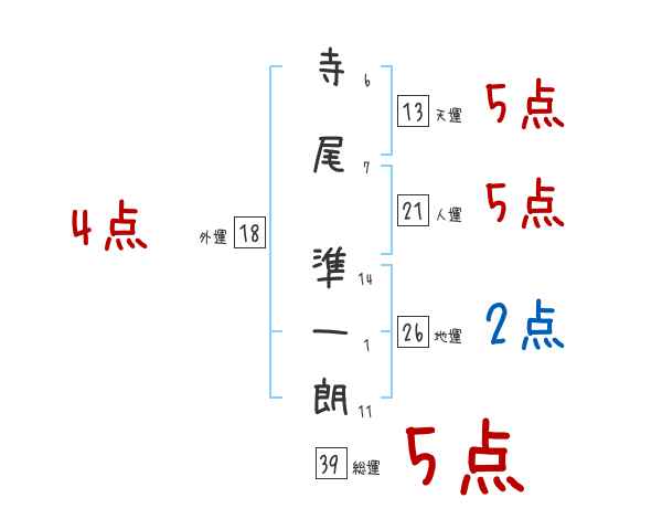 外運![]() | 寺尾準一朗さんの外運は18画の4つ星!情熱的で剛気。忍耐力があり信頼される。 生活面を象徴する運勢です。外部から受ける影響力を表し、結婚運、家庭運や職場、環境への順応性を表します。 |