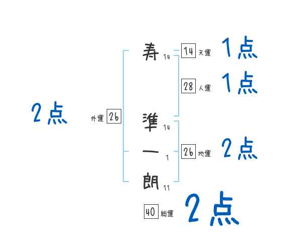 天運![]() | 寿準一朗さんの天運は14画の1つ星!人に対して優しいがストレスを溜め込みがち。人間関係のトラブルを避けるよう気をつけましょう。 家系が持つ宿命的な運勢を表します。祖先から受け継いだ苗字ですので自分の力が及びません。家柄を象徴します。 |