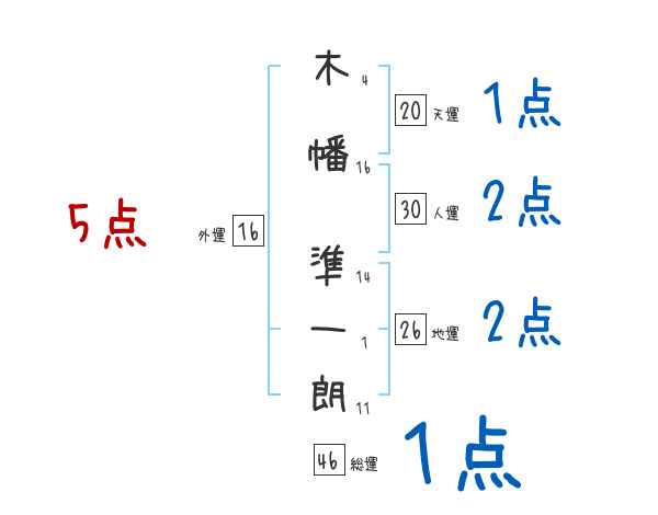 外運![]() | 木幡準一朗さんの外運は16画の5つ星!人望が厚く大きく発展する。逆転成功が見える。 生活面を象徴する運勢です。外部から受ける影響力を表し、結婚運、家庭運や職場、環境への順応性を表します。 |