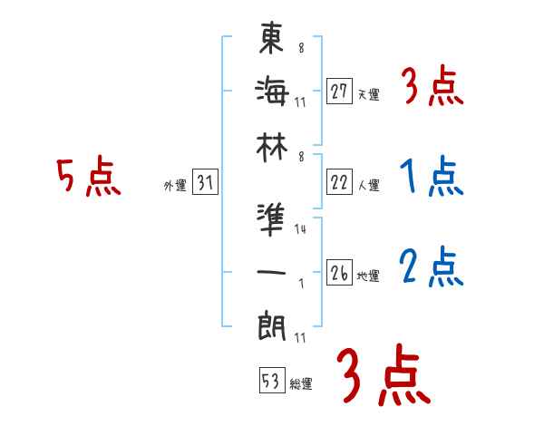 総運![]() | 東海林準一朗さんの総運は53画の3つ星!やや見栄っ張りで虚栄心がある。散財に注意。 あなたの人生を表す1番重要な運勢です。生涯を通じて影響する総合運となり、主に50歳以降の晩年期に影響を及ぼします。 |