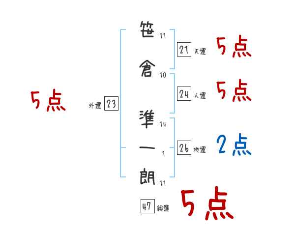 天運![]() | 笹倉準一朗さんの天運は21画の5つ星!統率力がある。独立し成功する。名誉を手に入れる。 家系が持つ宿命的な運勢を表します。祖先から受け継いだ苗字ですので自分の力が及びません。家柄を象徴します。 |