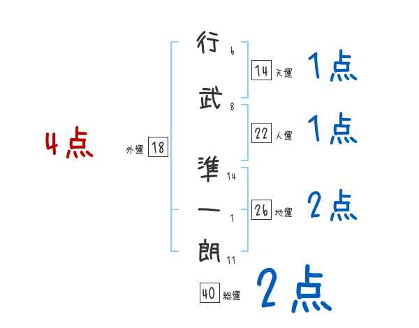 外運![]() | 行武準一朗さんの外運は18画の4つ星!情熱的で剛気。忍耐力があり信頼される。 生活面を象徴する運勢です。外部から受ける影響力を表し、結婚運、家庭運や職場、環境への順応性を表します。 |