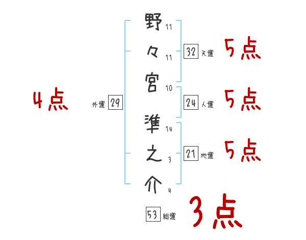 天運![]() | 野々宮準之介さんの天運は32画の5つ星!柔軟性があり成功する。チャンスが多く金運が良い。 家系が持つ宿命的な運勢を表します。祖先から受け継いだ苗字ですので自分の力が及びません。家柄を象徴します。 |