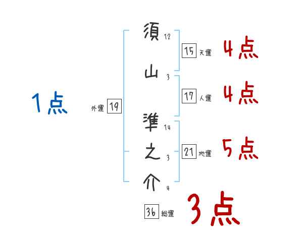 総運![]() | 須山準之介さんの総運は36画の3つ星!先見性が豊かです。多少神経質で苦労することも。 あなたの人生を表す1番重要な運勢です。生涯を通じて影響する総合運となり、主に50歳以降の晩年期に影響を及ぼします。 |