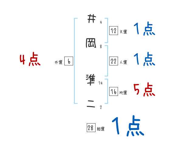 総運![]() | 井岡準二さんの総運は28画の1つ星!家庭環境に注意。スポーツで活躍できる能力があるかも。 あなたの人生を表す1番重要な運勢です。生涯を通じて影響する総合運となり、主に50歳以降の晩年期に影響を及ぼします。 |