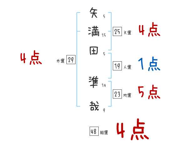天運![]() | 矢満田準哉さんの天運は25画の4つ星!個性があり才能があふれる。強運の持ち主で発展する。 家系が持つ宿命的な運勢を表します。祖先から受け継いだ苗字ですので自分の力が及びません。家柄を象徴します。 |