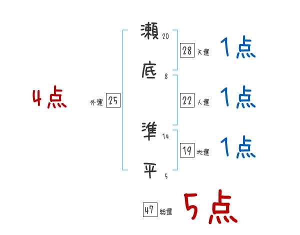 天運![]() | 瀬底準平さんの天運は28画の1つ星!家庭環境に注意。スポーツで活躍できる能力があるかも。 家系が持つ宿命的な運勢を表します。祖先から受け継いだ苗字ですので自分の力が及びません。家柄を象徴します。 |