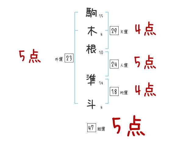 総運![]() | 駒木根準斗さんの総運は47画の5つ星!実力が開花し発展する円満な人生。財に恵まれる。 あなたの人生を表す1番重要な運勢です。生涯を通じて影響する総合運となり、主に50歳以降の晩年期に影響を及ぼします。 |