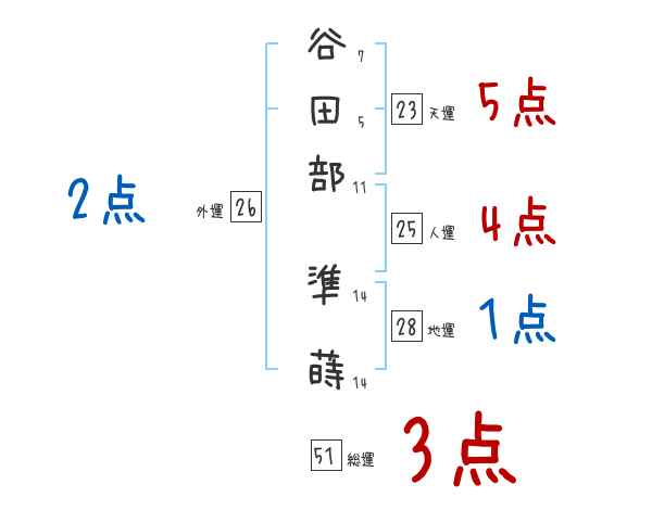 外運![]() | 谷田部準蒔さんの外運は26画の2つ星!波瀾万丈かも。信頼できる人を大事にしましょう。 生活面を象徴する運勢です。外部から受ける影響力を表し、結婚運、家庭運や職場、環境への順応性を表します。 |