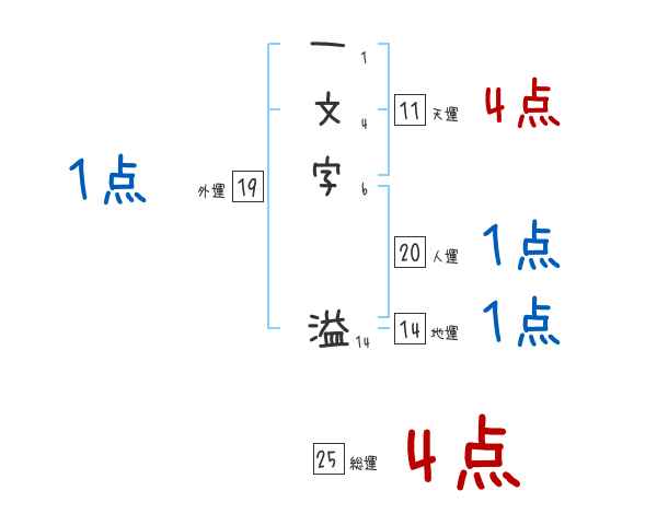 外運![]() | 一文字溢さんの外運は19画の1つ星!優れた才能を持ちますが、協調性が足りないことも。周りの人と協力する事を意識しましょう。 生活面を象徴する運勢です。外部から受ける影響力を表し、結婚運、家庭運や職場、環境への順応性を表します。 |
