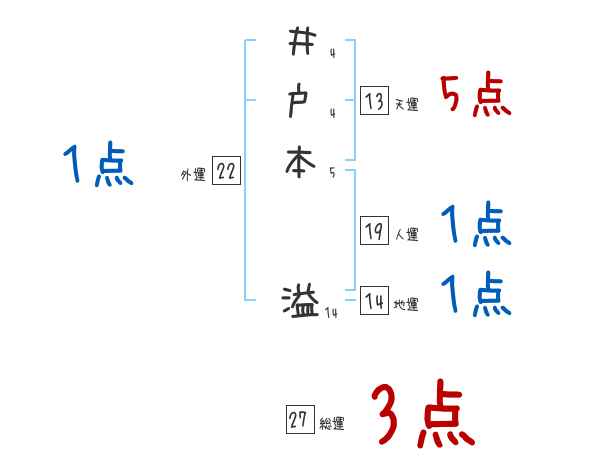 天運![]() | 井戸本溢さんの天運は13画の5つ星!才能に恵まれ人気がある。名声を手に入れる。円満な人生。 家系が持つ宿命的な運勢を表します。祖先から受け継いだ苗字ですので自分の力が及びません。家柄を象徴します。 |
