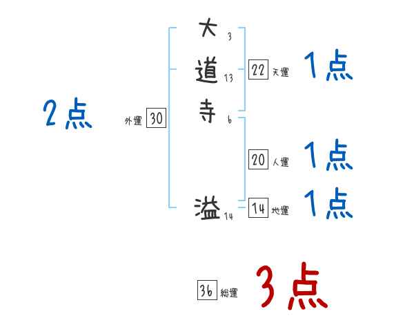 総運![]() | 大道寺溢さんの総運は36画の3つ星!先見性が豊かです。多少神経質で苦労することも。 あなたの人生を表す1番重要な運勢です。生涯を通じて影響する総合運となり、主に50歳以降の晩年期に影響を及ぼします。 |