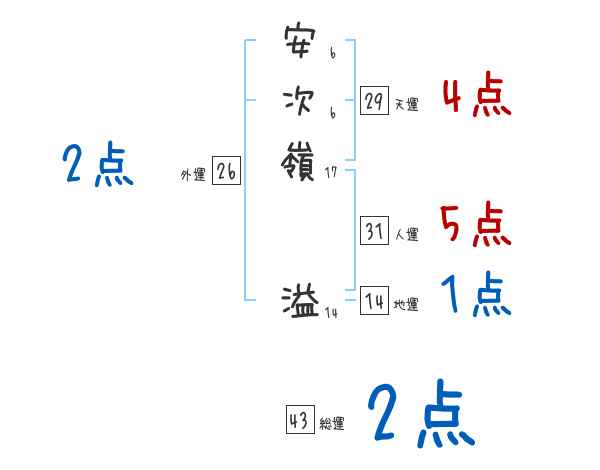 総運![]() | 安次嶺溢さんの総運は43画の2つ星!頑固な性格で独立心が強いかも。やや非現実的で浪費に注意しましょう。 あなたの人生を表す1番重要な運勢です。生涯を通じて影響する総合運となり、主に50歳以降の晩年期に影響を及ぼします。 |