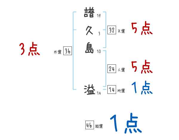 天運![]() | 譜久島溢さんの天運は32画の5つ星!柔軟性があり成功する。チャンスが多く金運が良い。 家系が持つ宿命的な運勢を表します。祖先から受け継いだ苗字ですので自分の力が及びません。家柄を象徴します。 |