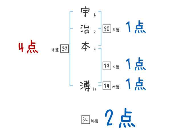 総運![]() | 宇治本溥さんの総運は34画の2つ星!独創性に優れるが、自尊心が強く災難に注意しましょう。 あなたの人生を表す1番重要な運勢です。生涯を通じて影響する総合運となり、主に50歳以降の晩年期に影響を及ぼします。 |