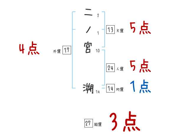 外運![]() | 二ノ宮溯さんの外運は17画の4つ星!積極的な行動力。地位を気づき財産を手に入れる。純粋な心と直感力。 生活面を象徴する運勢です。外部から受ける影響力を表し、結婚運、家庭運や職場、環境への順応性を表します。 |