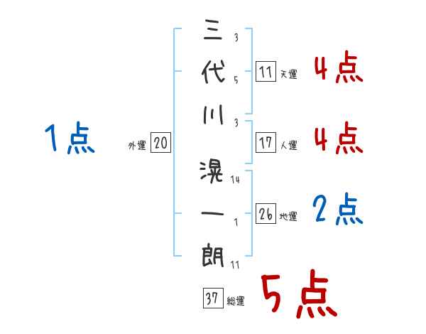 天運![]() | 三代川滉一朗さんの天運は11画の4つ星!着実に富や地位を得る幸運な人生。 家系が持つ宿命的な運勢を表します。祖先から受け継いだ苗字ですので自分の力が及びません。家柄を象徴します。 |
