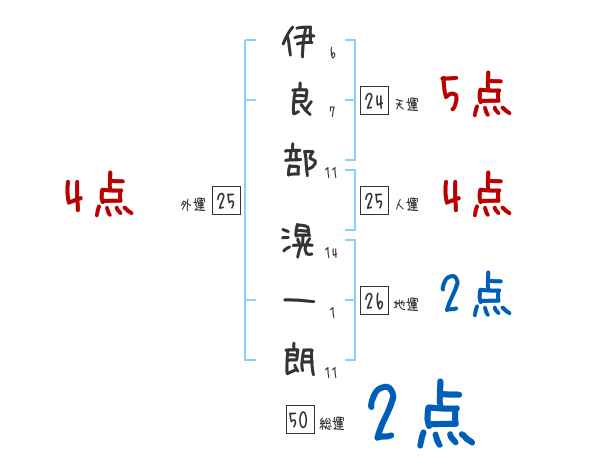 天運![]() | 伊良部滉一朗さんの天運は24画の5つ星!家庭運が良く順調な人生。金運にも恵まれる。 家系が持つ宿命的な運勢を表します。祖先から受け継いだ苗字ですので自分の力が及びません。家柄を象徴します。 |